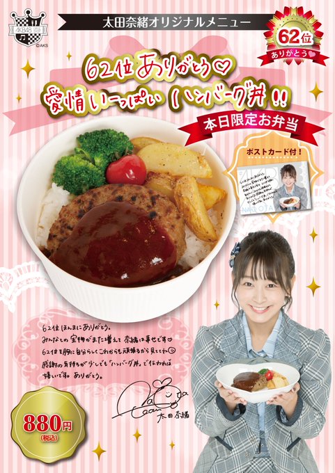 明日24日に、AKB48カフェ&ショップ秋葉原テイクアウトコーナーで「太田奈緒特製ハンバーグ弁当(メッセージカード付)」を数量限定で販売します🤤💕このお弁当のお渡し会は16:30~17:30の間です!!イベントの抽選が外れた方も、ぜひお渡し会に来てください😘