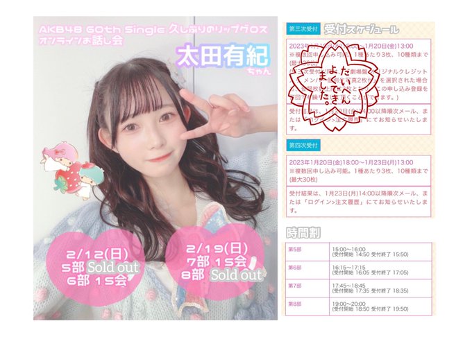 太田有紀 (AKB48 17期研究生)@yuki_ota0327 -- 本日13:00までです😵💫❕🔗akb48.chara-ani.com twitter.com/yuki_ota0327/s… 太田有紀 (AKB48 17期研究生) #オンラインお話会 再販受付中です🎀なんとなんとオススメしていた2/12(日)5部も完売です😭♡本当にありがとうございます🥺♡今回で2/12(日)6部は今回が受付最後なので待ってます🥂最近気になったよって方はこの機会に是非お話しましょう🗣💭🔗akb48.chara-ani.com pic.twitter.com/lzT3z4UIF6