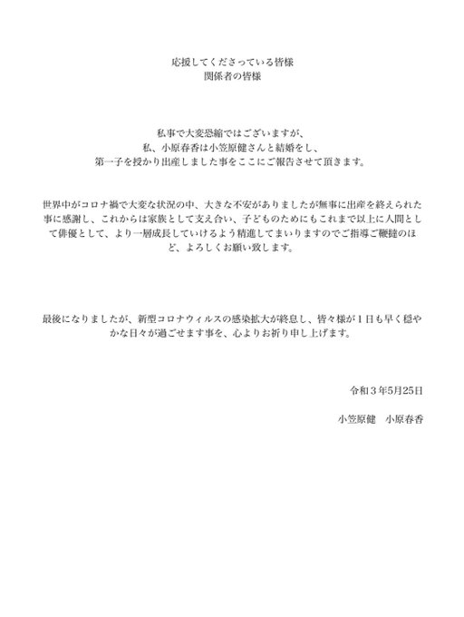 ブログでの突然のご報告となり驚かせてしまいましたが、この度小笠原健さんと結婚をし第一子を出産しました。