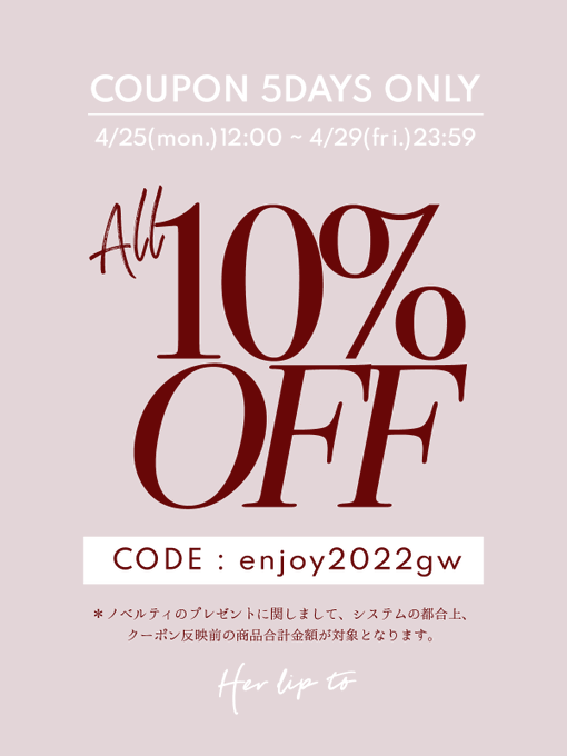 小嶋 陽菜@kojiharunyan -- 📣BASEの【10%OFF】クーポンがはじまったー🪄✨みんな使ってね💓👸 twitter.com/herlipto_info/… Her lip to 【𝖲𝖧𝖮𝖯𝖯𝖨𝖭𝖦 𝖢𝖮𝖴𝖯𝖮𝖭🎟】本日4/25(mon.)12:00〜5日間限定で〈ALL10%OFF〉クーポンをご利用いただけます❣️この機会にHer lip toでのお買い物をお楽しみくださいませ🛍[CODE:enjoy2022gw ]▼TAP TO SHOPherlipto.jp#Herlipto #ハーリップトゥ pic.twitter.com/bo33T67esx