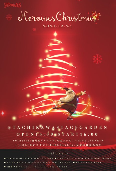 炎谷 莉奈 (夜光性アミューズ)@rina_yoruami -- クリスマスイブの詳細出たよー!!❤️イブもクリスマスも一緒に過ごしてくれる?? twitter.com/heroines_idol/… HEROINES(ヒロインズ) 🎄 Xmas LIVE🎄2021年12月24日(金)TACHIKAWA STAGE GARDENなんと最大収容人数3000人の会場でヒロインズクリスマス開催❕特典会は全グループサンタ衣装🎅🏻チケット特典には、ヒロインズからのクリスマスプレゼント🎁も付いてくるよ❕チケット発売(12/7 21:00~)r.y-tickets.jp/heroineschrist… pic.twitter.com/oZzl5p5Kfu