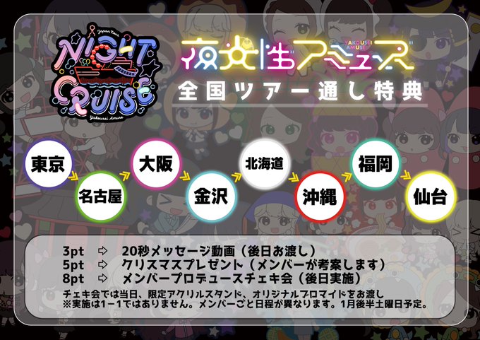 3ポイントで20秒動画、5ポイントでクリスマスプレゼント、8ポイント全通でプロデュースチェキ会♡ 一緒に色んな都市巡ってくれたら嬉しい⸝⸝> <⸝⸝ twitter.com/yoruamiofficia…