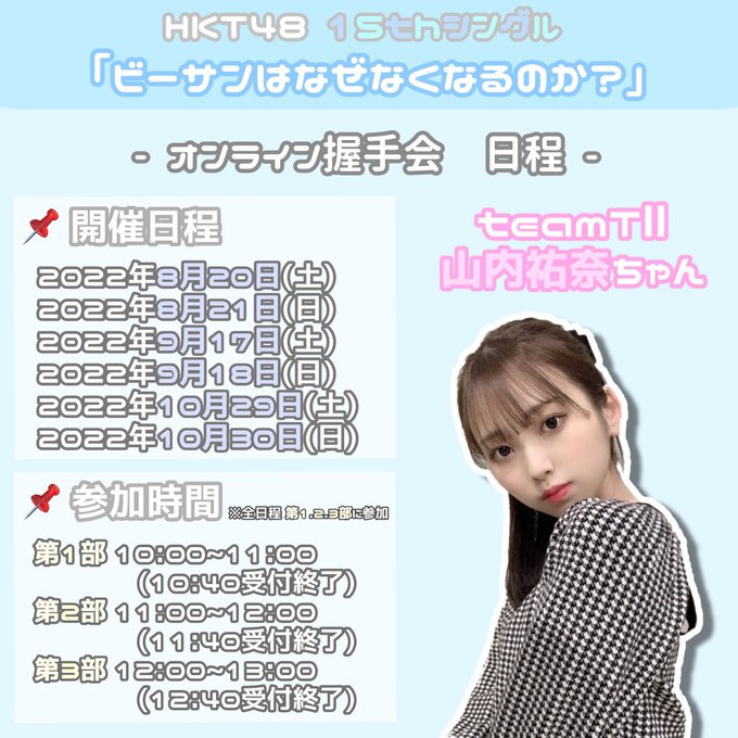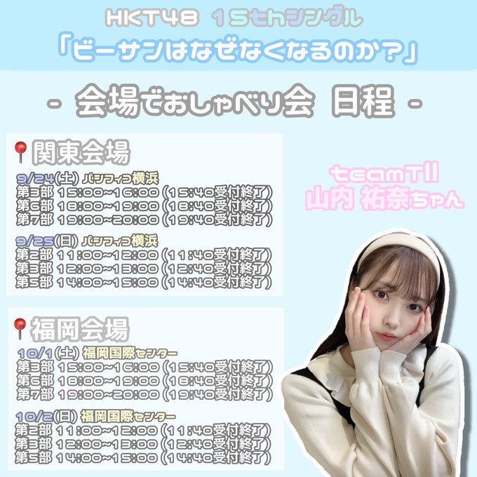 山内祐奈@yuna_0706hkt -- 第2次受付はじまっております😌ファンの方が作ってくれた日程画像全部保存しました🫧ありがとうね🥺💓entry.hkt48cd.shop/15thcd/ pic.twitter.com/G5JTEZN8vo