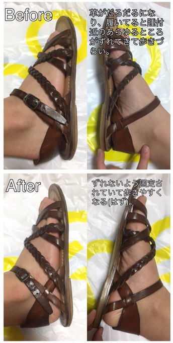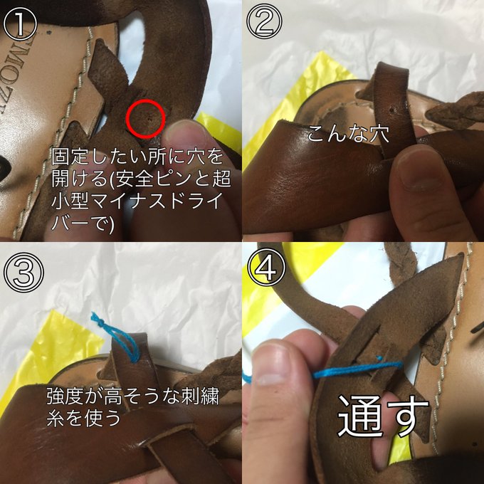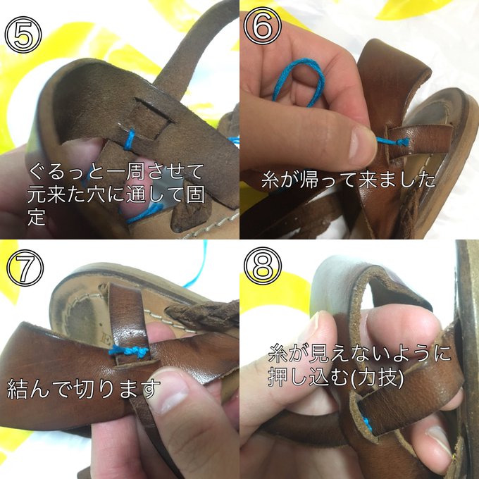 急に目覚めてお気に入りのサンダルの修理を自己流でしました。めっちゃうまくいったけど本当に本当になんでこんな時間にこんなことをはじめたの?? pic.twitter.com/kFtAqzfEJq
