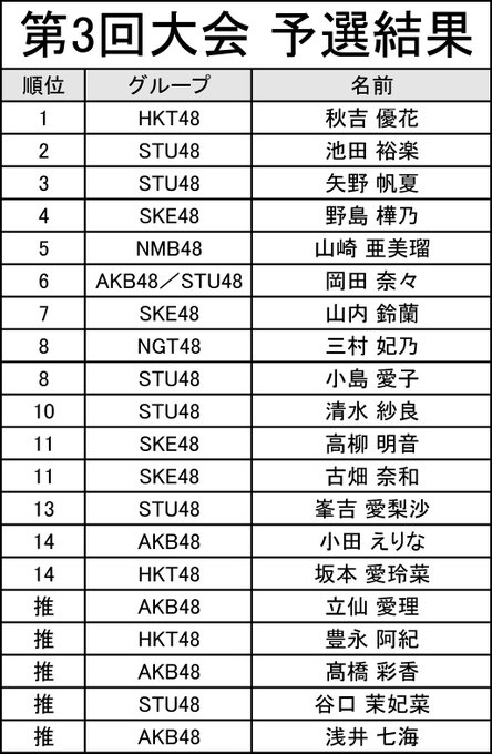 山崎 亜美瑠@_amiru_y -- 今年も決勝大会に進出できました!ここからです💪🏻💪🏻💪🏻💪🏻 twitter.com/akb48g_singer/… AKB48グループ歌唱力No.1決定戦<公式> 第3回 #AKB48歌唱力No1決定戦 決勝進出はこちらの20人に決まりました!おめでとうございます!決勝大会は12月1日(火)にTBS赤坂ACTシアターで開催。観覧席もご用意する予定です。詳細は後日お知らせします。立候補した134人のみなさま、素敵な歌声をありがとうございました! pic.twitter.com/Fqe1of1xDj