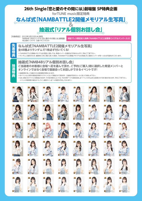 山本望叶@_NYANMIKA_ -- リアル個別お話会...!!!会いたいな〜🥰🥰? twitter.com/nmb48_official… NMB48 Official #NMB48 26thシングル『#恋と愛のその間には』劇場盤 SP特典企画! 💖forTUNE music限定特典💖“なんば式「NAMBATTLE2開催メモリアル生写真」(&抽選式「リアル個別お話し会」)”付き販売決定✨✅1/26(水)12時から受付開始詳細はコチラ👇news.nmb48.com/?p=29006#NAMBATTLE2 投票券付き‼️ pic.twitter.com/qhyxCV7ZPx
