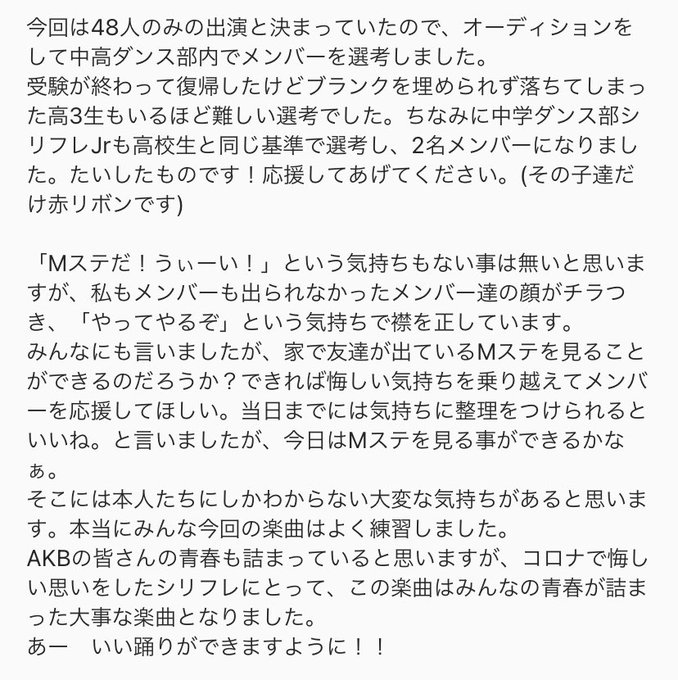 みんなのビジュアルが … 震えるくらい … 良すぎる … Mステさんの照明との相性がいいのも確信に変わった … ダンスも揃っていて、でもアイドルらしさもあって、もう素敵 … 映像も見て、AKBメンバーとシリフレさんの思いが今日に詰まっていて泣きそうになりました😢