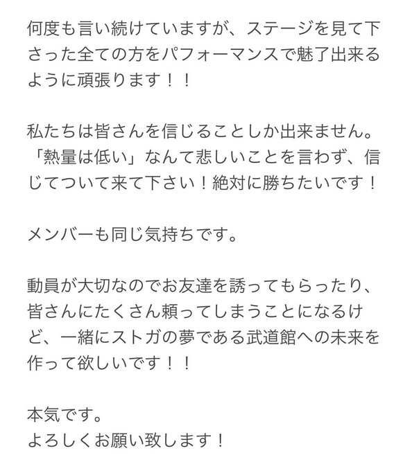 皆さんひとりひとりが来るか来ないかで結果が変わってきます。だから、自分なんかが行かなくても大丈夫でしょ、なんて思わずに絶対に来てほしいです。ストがメンバーのツイートやこの引RTのちゃんたい先生の元ツイートを見て頂いたらわかる通り私達は本気です!
