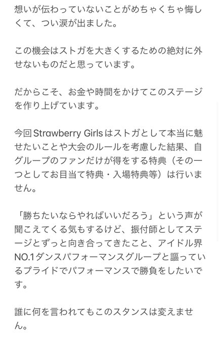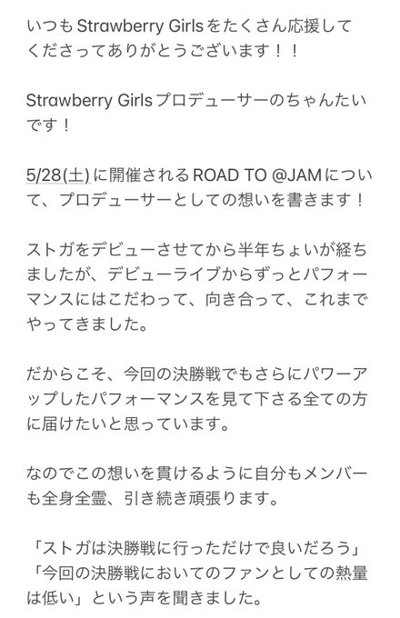 山田寿々(Strawberry Girls)@stg_suzu 今、応援してくださっているストふぁむの皆さんに向けてのステージだけではなく来て下さる方全員がストふぁむになって頂けるように誰が見てもストガのステージ楽しかった!って思って頂けるようにパフォーマンスで結果を出します。28日の特別演出とっても凄いよ❤️🔥