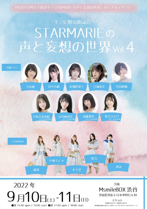 山田麻莉奈@maririchan_324 -- 急遽ですが..!こちらの朗読劇に出演させて頂くことになりました!📖´-わたしは9月11日に出演となります!よろしくお願い致します!!⠉̮⃝︎︎ twitter.com/shibuya2theate… キミに贈る朗読会📖9/3-4 サトラレ【公式】 【出演者変更】#STARMARIEの声と妄想の世界 Vol4⃣小坂井祐莉絵さん、スケジュールの都合により、9/10のみ出演に変更とさせて頂きます🙇🙇そして、9/11追加キャストとして、#山田麻莉奈 さんの出演が決定しました‼ご確認お願い致します‼チケット予約受付中🎫msmilebutai.com pic.twitter.com/kXeNP2Fst1