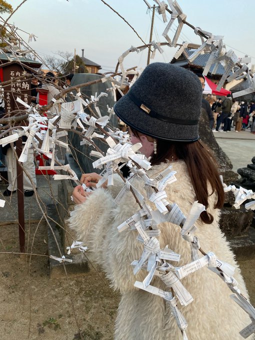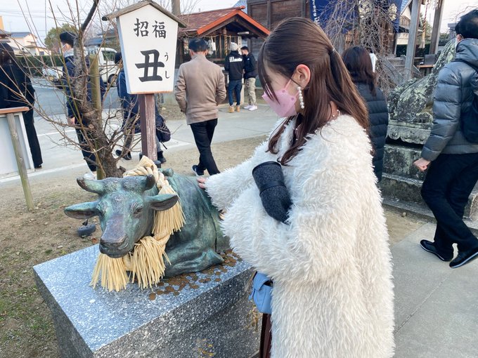 山田麻莉奈@maririchan_324 -- 今年も妹と一緒に筑後の水田天満宮と恋木神社行ってきました!福よ来い〜って祈りながら丑撫でてたら撮られてた。福よ来い〜〜 pic.twitter.com/D9vnJsMo1A