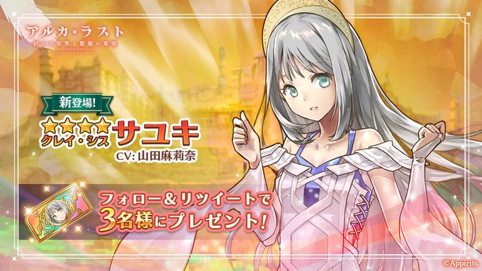 山田麻莉奈@maririchan_324 -- ついにサユキちゃん実装です!!うれしい....💙この機会に是非フォローとRTをして応募してみてください!!ꪔ̤ twitter.com/arca_last/stat… アルカ・ラスト 終わる世界と歌姫の果実【公式】 【3.5周年記念緊急特別キャンペーン!】祝・アルラス3.5周年!🎉次回メンテナンス終了後に『サユキ』が新登場!フォロー&RTでCPに応募しよう!✨抽選で3名様にサユキが必ず貰える「サユキ確定召喚チケット」をプレゼント🎁応募期限は1/27(金) 13:59まで!当選者はメンテ中に決定!#アルラス pic.twitter.com/NhfslWy4VV