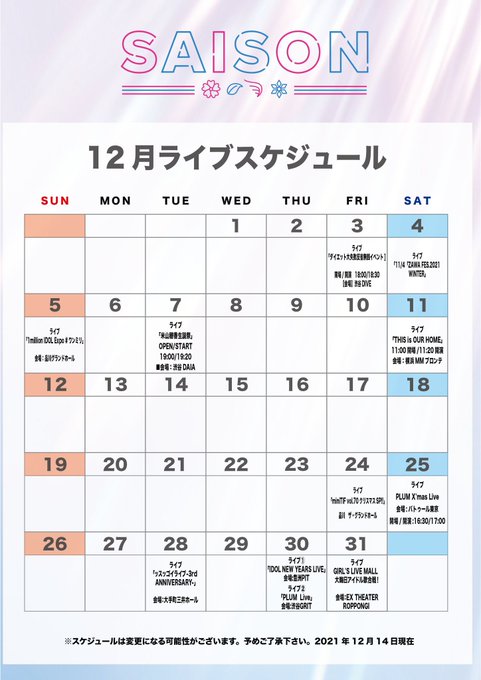 SAISON12月ライブスケジュール💖