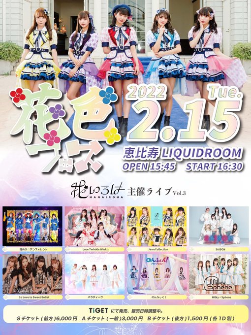 岡田彩花@ayaka_o1106 -- 2月15日のライブ詳細✨みんな確認よろしくです🔥 twitter.com/saison_idol/st… SAISON 2022年2月15日(火) ■『 花いろは主催ライブ「花色フェス vol.3」』 ■会場 恵比寿 LIQUIDROOM (東京都渋谷区東3-16-6) ■時間 開場15:45 開演16:30 ■料金 Sチケット(前方席)6,000円 Aチケット(一般)3,000円 Bチケット(後方) 1,500円 (各1D別) ■販売 TIGET 調整中 pic.twitter.com/AdXIMgufg2