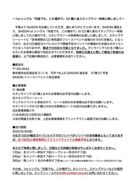 岡田彩花@ayaka_o1106 -- リリイベのスタンプラリーについて✨元ツイートの確認をお願いします😊#セゾン twitter.com/saison_idol/st… SAISON 【スタンプラリー特典について】リリイベに参加していただきましたお客様よりスタンプラリーに関してのご質問があり、レーベルと協議し以下措置を取らせていただきます。またリリイベファイナルは東京某所にて9/19(月祝)に開催予定となります。オフ会の詳細発表は今しばらくお待ちください。 pic.twitter.com/6CjCPzA7ax