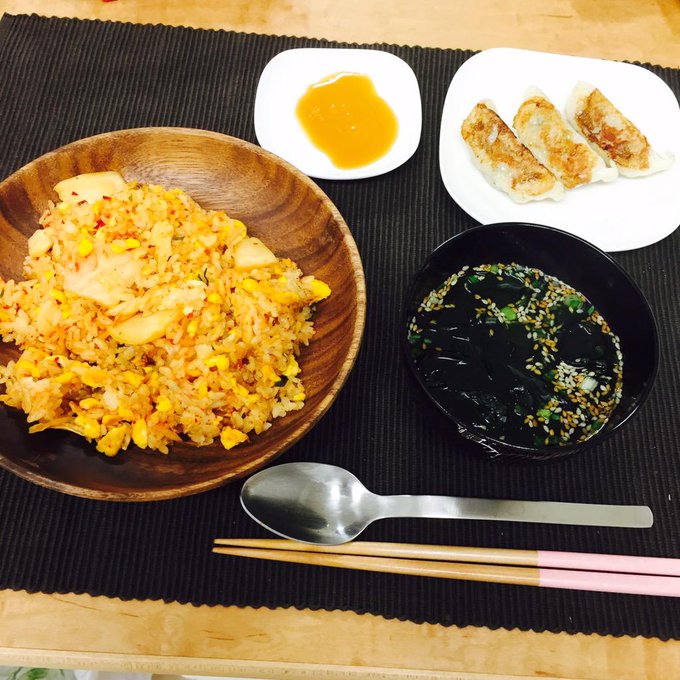 いつかのキムチチャーハンと餃子焼いただけのご飯( ´ ▽ ` )ぱっと作れるものじゃないと作る気しません…食べるより作る時間があまりに長いと…(꒪⌓꒪) #えび pic.twitter.com/gaJXIk1NyZ
