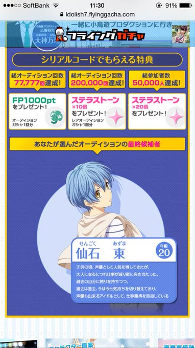 今日の20:00からアイドリッシュセブン始まるよおー楽しみー(((o(*゚▽゚*)o)))オーディションでは仙石東くんを選びました可愛いー pic.twitter.com/LuluzJVdY1