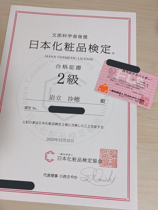 昨日showroomで話したのですが、11月の試験で食生活アドバイザー3級と化粧品検定2級に合格しました✨