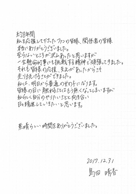本日を持ちまして私、島田晴香は芸能界を引退します。 pic.twitter.com/9BrPeGxOZl