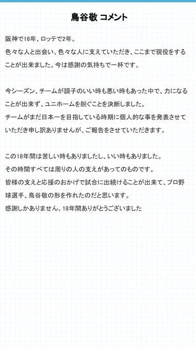 川上千尋@kchi_hi1217 -- 鳥谷選手😭😭みんなのヒーローでした😭18年間、希望を沢山くださってありがとうございました!!! twitter.com/livedoornews/s… ライブドアニュース 【お疲れ様でした】ロッテ、鳥谷敬の現役引退を正式発表news.livedoor.com/article/detail…鳥谷は「この18年間は苦しい時もいい時もあった」と振り返りつつ「皆様の支えと応援のおかげで試合に出続けることが出来た」と感謝を綴った。 pic.twitter.com/6rmxNfWYnm