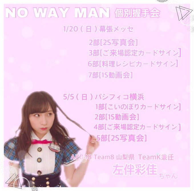 左伴彩佳@hidaaya_0729 -- 握手会の8次受付始まってます♪気になってくれてる方がいたらぜひ遊びに来てください☺️ twitter.com/hidaaya_0729/s… 左伴彩佳 54thシングルの握手会の申し込みが始まっています🤝♥︎1/20(日) 幕張メッセ 2.3.6.7部5/5(日) パシフィコ横浜 1.2.4.5部よろしくお願いします😊申し込み👇akb48.chara-ani.com画像はファンの方からお借りしました🙇🏻♀️ pic.twitter.com/fNebQX7CmU
