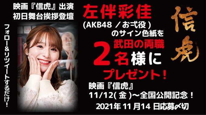 左伴彩佳@hidaaya_0729 -- いよいよ11/12に『信虎』全国公開です!初日舞台挨拶にも参加します✨サインのプレゼントもあるみたいなので、応募してね〜! twitter.com/nobutora_movie… 新 戦国時代劇『信虎』武田信玄生誕500年記念映画(11/12~全国公開)公式【三谷幸喜監督 絶賛】 #信虎 11/12〜全国公開記念!\フォロー&RTであたる/#映画 信虎出演、初日舞台挨拶登壇、左伴彩佳(AKB48/お弌役)のサイン色紙を武田の両職、2名様にプレゼント!応募は簡単!① @nobutora_movieをフォロー②この投稿をRT【応募〆切】11/14(日)23時59分#キャンペーン舞台挨拶の詳細は↓ pic.twitter.com/I9i4C5kODE
