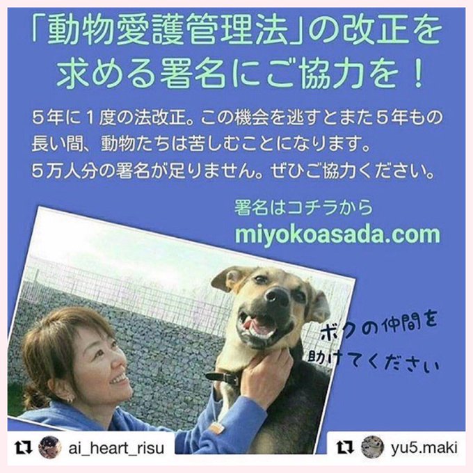 平松 可奈子@kanaco1114 -- 私も署名しました!! twitter.com/y3hyqrp2rm2qzl… なるは 締切まで半年きりました。五年に一度しかない法改正です。この機会を逃すと再び動物達は長年苦しみます。まだまだ数が足りません!一人でも多くの賛同が必要です!どうか賛同にご協力お願い致します!miyokoasada.com pic.twitter.com/FFbnaI1Rbk
