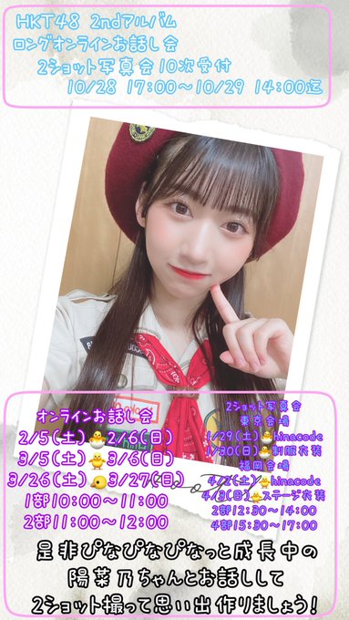後藤陽菜乃《HKT48》@hinapiyo38_hkt -- 現在のところは申し込みが最後になってます!🥺待ってるよ〜🥰 twitter.com/hinapiyo38_hkt… 後藤陽菜乃《HKT48》 HKT48 2nd Album第10次申し込みが17:00から始まってます☺︎❤︎一緒にお話したり写真撮ったりしましょ〜🥰会いに来てくれるの待ってるよ〜✨✨明日29日14:00までです!!entry.hkt48cd.shop/2ndalbum/ pic.twitter.com/MaL6CXMjEY