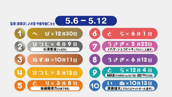 後藤陽菜乃《HKT48》@hinapiyo38_hkt -- わわわ!!ひなの名前がある!😳5位だって〜✨✨ twitter.com/zeroichi_ntv/s… ゼロイチ【公式】 #細かすぎる週間占い ✨\今週のトップ10/2位🐏 #小澤愛実(#ニアジョイ)さん5位🐤 #後藤陽菜乃(#HKT48)さん、7位🐰 #ノバクジョコビッチ さん9位🐯 #後藤拓磨(#THERAMPAGE)さん、#高雄さやか(#STU48)さん10位🐶 #渡邊雄太 さん来週1週間、超幸運な皆さまです🌟#ゼロイチ pic.twitter.com/Fcxh4FBKym
