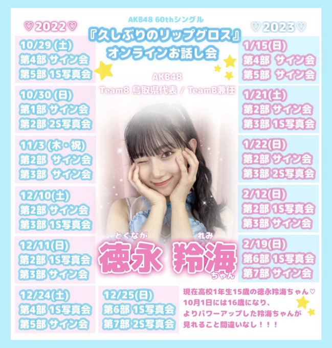 徳永羚海@48_RemiTokunaga -- 『久しぶりのリップグロス』お話会の受付が13時までです💄✨気になってる方や迷ってる方もたくさんの方お待ちしてます!!一緒に楽しみましょ〜😚 pic.twitter.com/2w1fc7o7Nk 徳永羚海@48_RemiTokunaga -- akb48.chara-ani.com