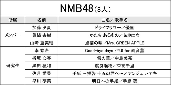 折坂心春(NMB48)☁️@cohanya_0306 -- NMBは15日の21時〜放送です🤍雪の華を歌わせていただきました❄️みてねっ!!! twitter.com/akb48g_singer/… AKB48グループ歌唱力No.1決定戦<公式> <予選1日目・第3組>#NMB48 8人の歌唱曲一覧です。tbs.co.jp/tbs-ch/item/o2…#AKB48歌唱力No1決定戦 pic.twitter.com/TmU7BpPLNr