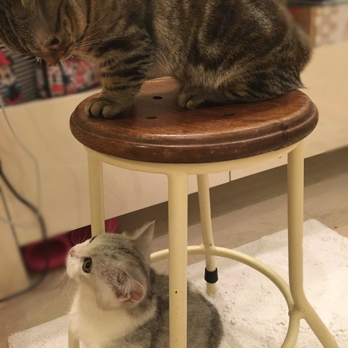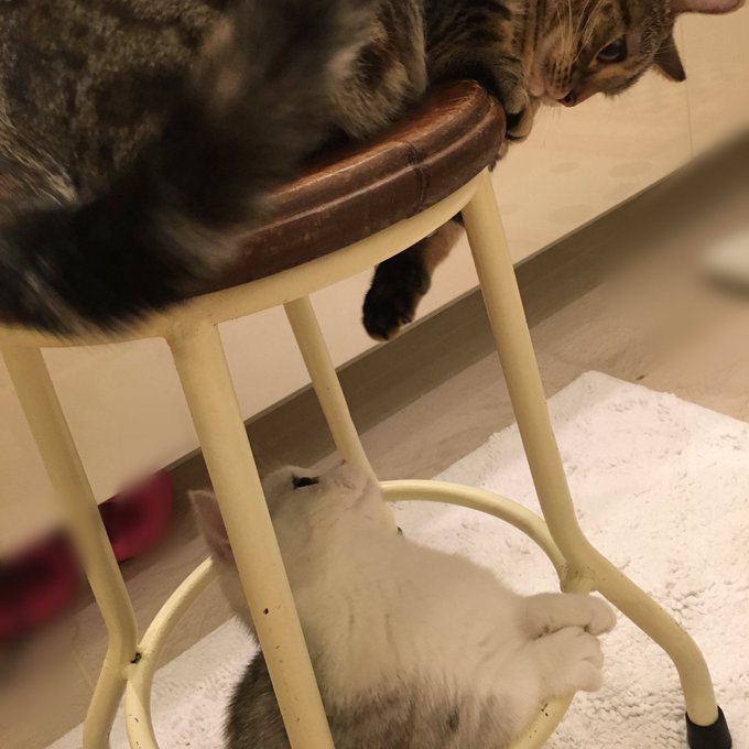カン太郎は飛び乗れるけど、ゴロウはまだちっちゃくて乗れないイスがあって。。最近はいつもゴロウが飛び乗れるように練習中😂自慢気なカン太郎もかわいいし健気なゴロウもかわいいよ〜っ pic.twitter.com/CAJG3Gn9g6