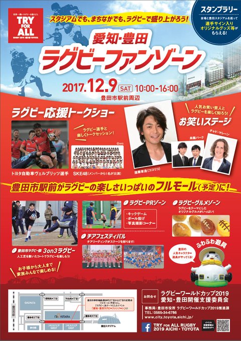 いよいよ #ラグビーワールドカップ PRイベント「愛知・豊田ラグビーファンゾーン」今週末に迫りました‼️12月9日は豊田市でお待ちしています😆🌈🏉 twitter.com/rugbyworldcupj…