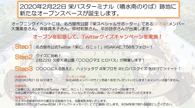 私たちの大好きな栄の街に新たに誕生する「ミツコシマエ ヒロバス」のオープニーグイベントに参加させていただきます!テープカットにトークショー、SKE48ステージなど盛り沢山😊2月22日、皆さんぜひ栄に遊びに来てください! #栄プロモ #ミツコシマエヒロバス #SKE48 twitter.com/sakae_758/stat…