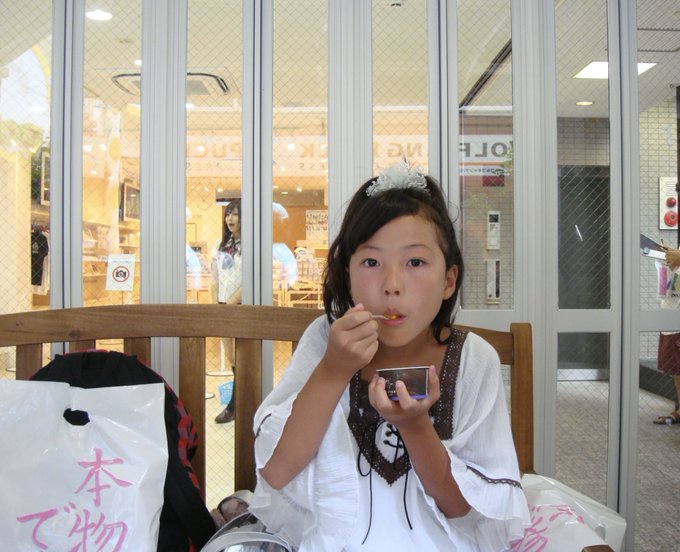 9年前の写真…!原宿の竹下通りにAKBショップがオープンしてパパママに連れてってもらったの☺︎ 買い物を終えてショップの前のベンチでアイス食べてる🍨