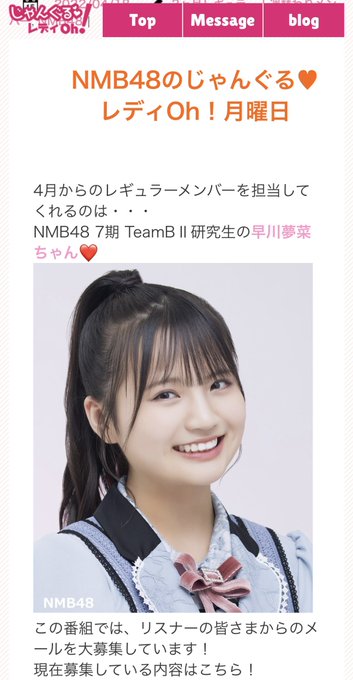 早川夢菜(NMB48)@yunanan0919 -- わあー!大好きな先輩方と8期生ちゃん初登場❕❔💖お便りお待ちしてます💖 twitter.com/jro_yesfm/stat… YES-fm【じゃんぐる❤レディOh!】 #ゆななん の #じゃんレディ月次回のゲストメンバーが決定しました✨ (4/28 9:00〆切)#泉綾乃ちゃん × #出口結菜ちゃん #坂田心咲ちゃん × #桜田彩叶ちゃん🟡メンバーへの質問や目撃情報🔵パクパクメール🟢雑学メールなど大募集しています😍bit.ly/3fXMNqe#8期生初じゃんレディ pic.twitter.com/c44JMbRbEP