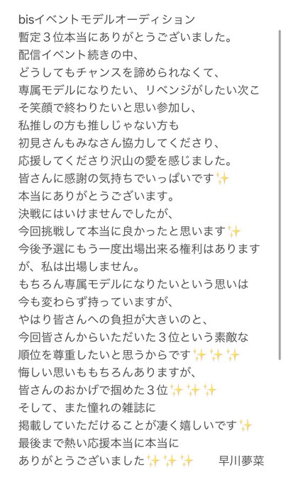 早川夢菜(NMB48)@yunanan0919 イベ終了間際には少しでも必ず配信します❗️私が本気で諦めていないのも皆さんに伝わってると思いますので応援してくださる皆さんと笑顔でイベ終了を迎えたいので本当に最後までよろしくお願いします❗️ただ、終了間際ギリギリだとポイント反映されない場合もあると耳にしたのでよろしくお願いします🙇♂️