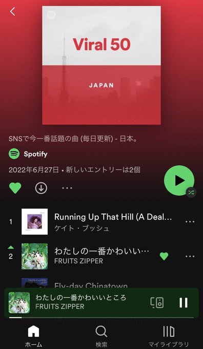 月足天音 (FRUITS ZIPPER)@amane_fz1026 -- やばい……お父さんいわくJPOPでは1位だって、たしかに。 twitter.com/fruits_zipper/… FRUITS ZIPPER【Official】 🔥🔥バイラルチャート2位🔥🔥画像1枚目→6/25(土) バイラル3位画像2枚目→6/27(月) バイラル2位に、にににに、にに2位⁉️⁉️⁉️『わたしの一番かわいいところ』MVが公開されランキング急上昇✨もしかして、、もしかして、、!!って思っちゃいますが!!ありがとうございます💥#ふるっぱー pic.twitter.com/oQ715Vudh8