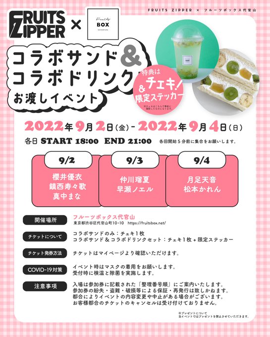 月足天音 (FRUITS ZIPPER)@amane_fz1026 -- こちら!よろしくお願いします!!🫠 twitter.com/fruits_zipper/… FRUITS ZIPPER【Official】 🍊🍋🍓🫐🍑🥝🍒🍇🍉フルーツボックスコラボ決定🍊🍋🍓🫐🍑🥝🍒🍇🍉9/2(金)~9/4(日)の3日間🌸フルーツボックス代官山にて🌸メンバーが店頭に現れます!✨8/18(木)20:30~チケット販売🔥passmarket.yahoo.co.jp/event/show/det…FRUITS ZIPPERがフルーツサンド🎊#FRUITSZIPPER #ふるっぱー#KAWAIILAB pic.twitter.com/VxYQcXi3r8