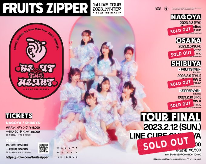 月足天音 (FRUITS ZIPPER)@amane_fz1026 -- 全部完売……ありがとうございます凄くびっくり嬉しい。 twitter.com/fruits_zipper/… FRUITS ZIPPER【Official】 【TOUR FINAL LINE CUBE完売】《FRUITS ZIPPER 1st One Man Tour 2023 -WINTER-♡BE AT THE HEART♡》・2/3(金)名古屋完売・2/5(日)大阪完売・2/9(木)東京(男性)完売・2/10(金)東京(女性)完売・2/12(日)東京TOUR FINAL完売🆕1stワンマンツアー全公演が完売!!#ふるっぱー #BEATTHEHEART pic.twitter.com/LFAsT6NSXp