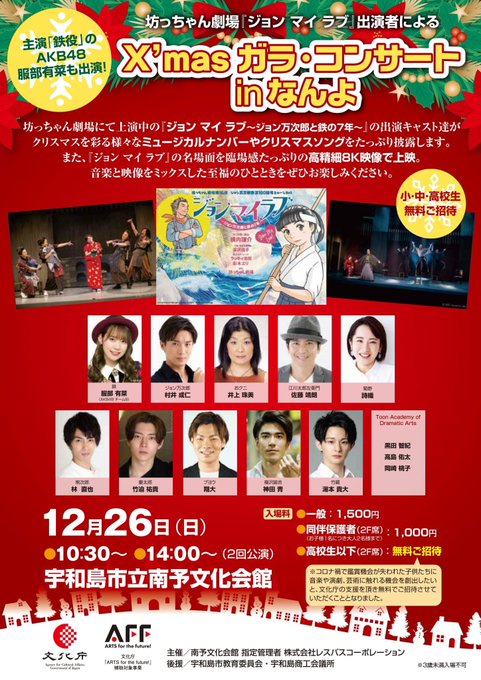 服部 有菜@__03yuna30 -- ぜひ来てください〜〜☺️🤍🤍🤍 twitter.com/botchan_theate… 坊っちゃん劇場 (愛媛県東温市のミュージカル常設劇場) 12月26日、#南予文化会館 で、#ジョンマイラブ のキャストが、クリスマスコンサートします!直前のお知らせになってしまいましたが、ぜひお待ちしております!!!#坊っちゃん劇場 #ジョンマイラブ🌊💖 #AKB48 twitter.com/Uwajima_city/s… pic.twitter.com/WS6oisd47K
