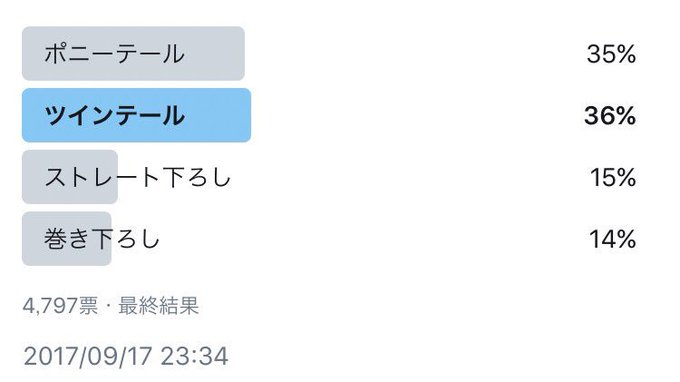 今村麻莉愛@maria_0914_ -- よっしゃ!!!ツインテールに投票したぜ!!! twitter.com/aoi_m_531/stat… 本村碧唯 皆さんアンケートありがとうございました〜😊ポニーとツインが接戦だったね😳ツインテール優勝🥇Mステ見てください〜探してね〜💗💗 pic.twitter.com/9ismd4dWBc 本村碧唯@aoi_m_531 -- @maria_0914_ ありがとう💗