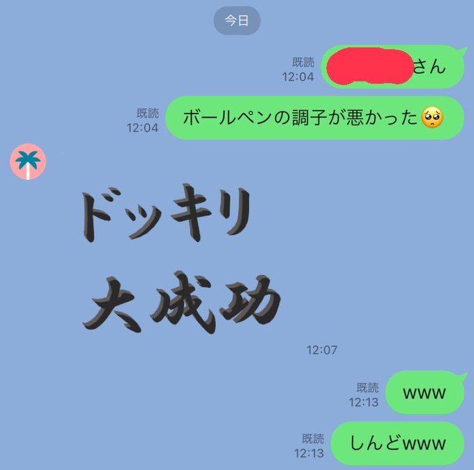 マネージャーさんにボールペン借りたらドッキリ大成功スタンプきた😂ただずっとややつかないボールペンだったんだけどwwwww pic.twitter.com/cnjUrY4SPh