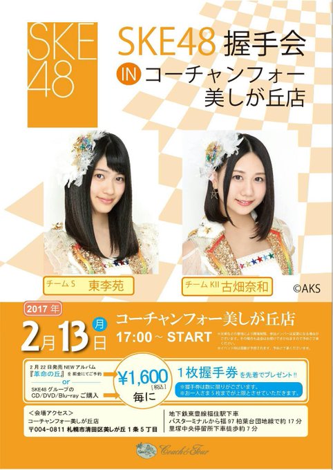 東李苑@rion_az13 -- 2月13日の17時〜コーチャンフォー美しが丘店さんにて握手会を開催させていただくことが決まりました!フルマリオンですよ〜平日となりますが是非お越しくださいお待ちしております…♪ pic.twitter.com/tJvLU4lBXc