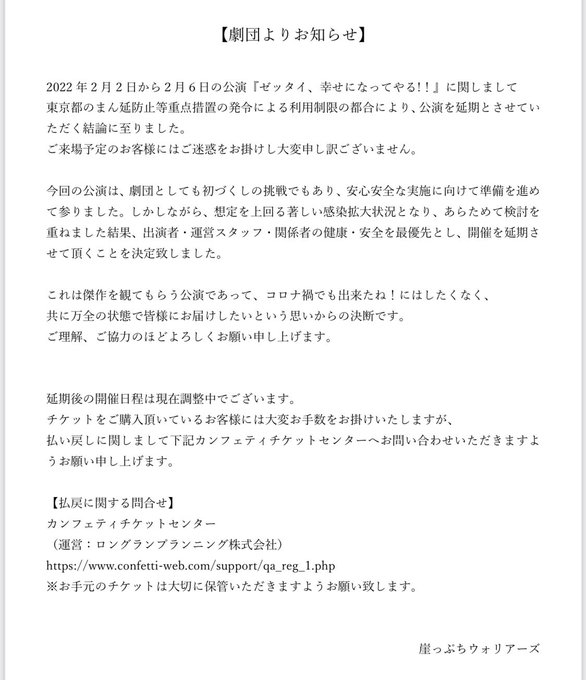 東由樹@yukitsun_0217 -- お知らせです。このような形になった事とても悔しいですが中止ではなく延期です。またいつか、ゼッタイ!!毎稽古楽しかったんだもんねーだ😭 twitter.com/gakewori/statu… 崖っぷちウォリアーズ 【公演延期のお知らせ】2022年2月2日~6日に予定しておりました『ゼッタイ、幸せになってやる!!』に関しまして、公演を延期させて頂く結論に至りました。ご観劇を楽しみにして下さっていた皆さま、心よりお詫び申し上げます。下記、ご一読ください。 pic.twitter.com/WOWW9S3B5T