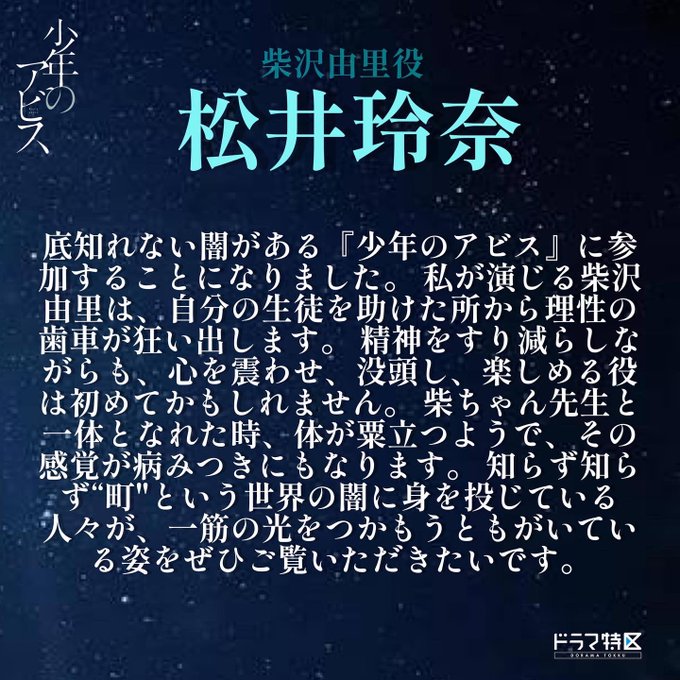 松井玲奈@renampme -- 実はこんな匂わせ動画も出てましたー twitter.com/dramatokku_mbs… 「少年のアビス」【ドラマ特区公式】@9/1放送スタート🌿 · · • • • • • · · · · • • • • • · · 🛻 𝐜𝐨𝐦𝐦𝐢𝐧𝐠 𝐬𝐨𝐨𝐧... 🏫 ✖️✖️ ✖️✖️ 「 #アビスのキャスト 」· · • • • • • · · · · • • • • • · ·#少年のアビス#ドラマ特区#9月1日放送スタート#柴沢由里 #柴ちゃん先生 pic.twitter.com/DremLsnCXa