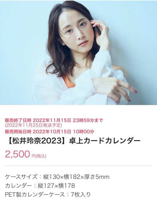 松井玲奈@renampme -- カレンダー販売の開始しました!!よろしくお願いします。 twitter.com/renampme/statu… 松井玲奈 明日、10月15日10時より、ファンクラブのECサイト内にて2023年のカレンダーが販売開始となります!数量が決まっているので、ご入用の方はお早めに!過去1の仕上がりになっている自信作です!fanicon.net/web/shops/4542 pic.twitter.com/jGvhrUIlls