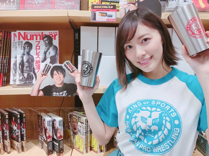 水色のライオンマークTシャツを着て、HMV栄で開催中の新日本プロレス展にプロレス大好きSKE劇場支配人湯浅さんとお邪魔しました🎵