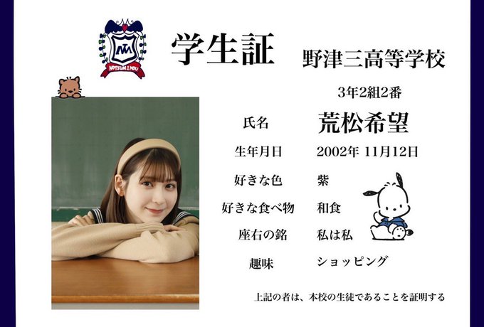 松岡菜摘@natsumi_m8 -- 2002年うまれ!!!なんかうれしい twitter.com/gekihaji_myun/… 『水色アルタイル』公式 今日は荒松希望ちゃんの学生証です💜のんちゃんの座右の銘は"私は私"なんだかかっこいいですね...🙊💭そんなのんちゃんは #水色アルタイル でどんな一面を見せてくれるのかお楽しみに⸜❤︎⸝#劇はじ#ミュン密 pic.twitter.com/xA9KeX717M