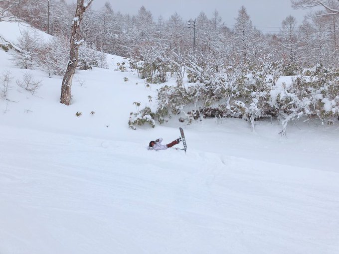 松本慈子@chikako_1119 -- 正解は、、、ふかふかすぎて出られなくなり、手を借りたのにも関わらず、ボードが刺さって出られなかった。でした😛#スキー部#ウィンタースポーツ部作りたいなぁ🥺🥺🥺 pic.twitter.com/Qb6nftHAml